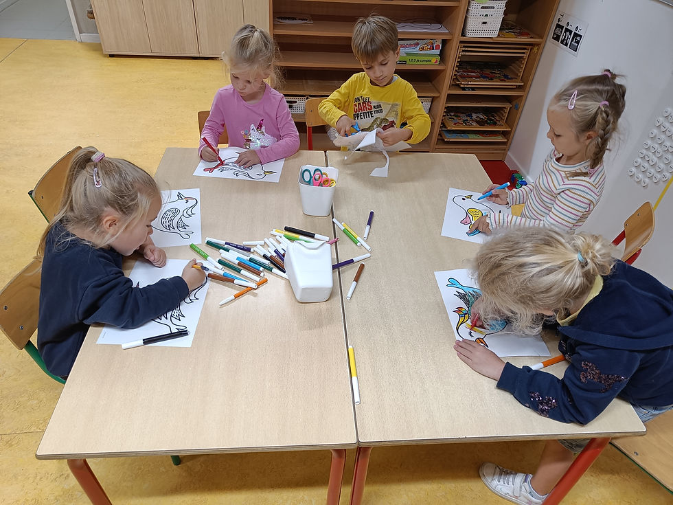 -Aan de lichttafel experimenteren we met veren en kunnen we mooie vogels overtekenen en inkleuren.