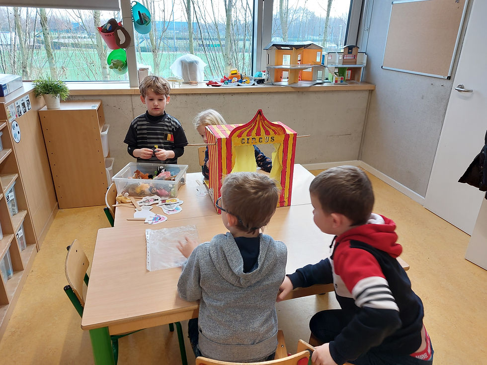Circus attributen verkopen en extra personages in de poppenhoek zoals circusdirecteur, acrobaten, touw danseres, leeuwentemmer,... (Een circustent van maken)